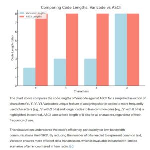 Question (A-005-008-001) delves into identifying a digital code characterized by elements of unequal lengths. The correct answer, A. Varicode, highlights Varicode’s unique feature. Varicode is designed with efficiency in mind, particularly for low-bandwidth communications like PSK31. Unlike fixed-length codes like ASCII or Baudot, Varicode assigns shorter codes to more frequently used characters and longer codes to less common ones. This variation in code length allows for more efficient data transmission, as it reduces the overall number of bits needed to represent common text, making it especially useful in bandwidth-limited scenarios often encountered in ham radio.