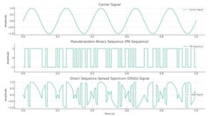 The graph above illustrates the principle of Direct Sequence Spread Spectrum (DSSS) communication. DSSS is a method where a high-rate binary sequence, often pseudorandom (referred to as a Pseudorandom Noise or PN sequence), is used to modulate a carrier signal. This process effectively spreads the signal across a wider frequency band than what the original unmodulated carrier would occupy.