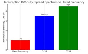 The graph above illustrates the security aspect of Spread Spectrum compared to traditional fixed-frequency transmission by focusing on the difficulty of signal interception: